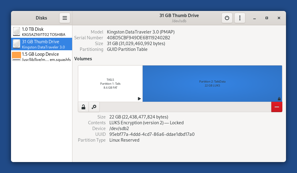 • 1 volume with a TailsData label and LUKS content.